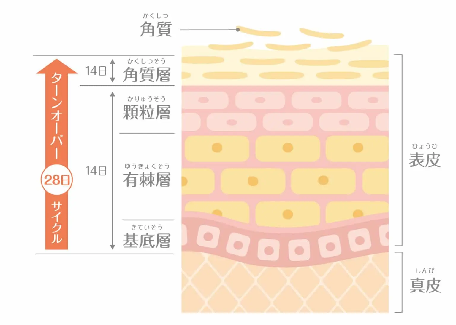 このターンオーバーの周期は部位により異なりますが、およそ28日程度と考えられています。皮膚の厚さや血行などが関係しており、顔はほかの部位より早く、一般的に理想は28日。基底層から顆粒層までが14日、角質細胞となって剥がれ落ちるまで14日が目安となっています。ほかの部位、例えばカカトなどは遅く、顔の肌の約2~3倍かかるとも言われています。
