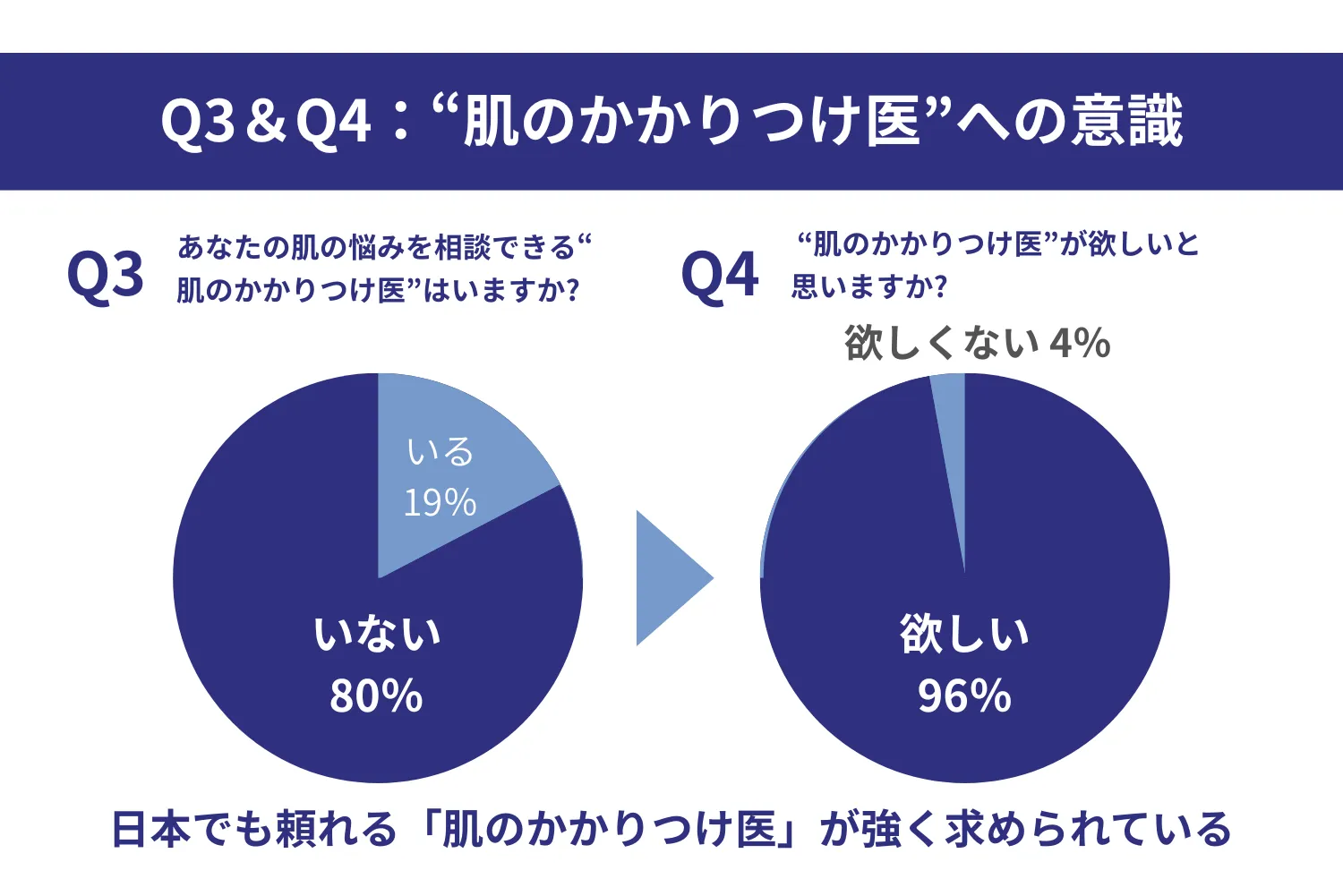 アンケートの結果、肌の悩みを相談できる「肌のかかりつけ医」がいないと答えた方は、約8割にのぼりました。一方で、注目すべきは「いない」と答えた方のうち、実に約96%が「かかりつけ医が欲しい」と考えている点です。これは、多くの方がセルフケアの限界を自覚し、専門家による的確なアドバイスや解決策を求めるニーズが高まっていることを示唆しています。