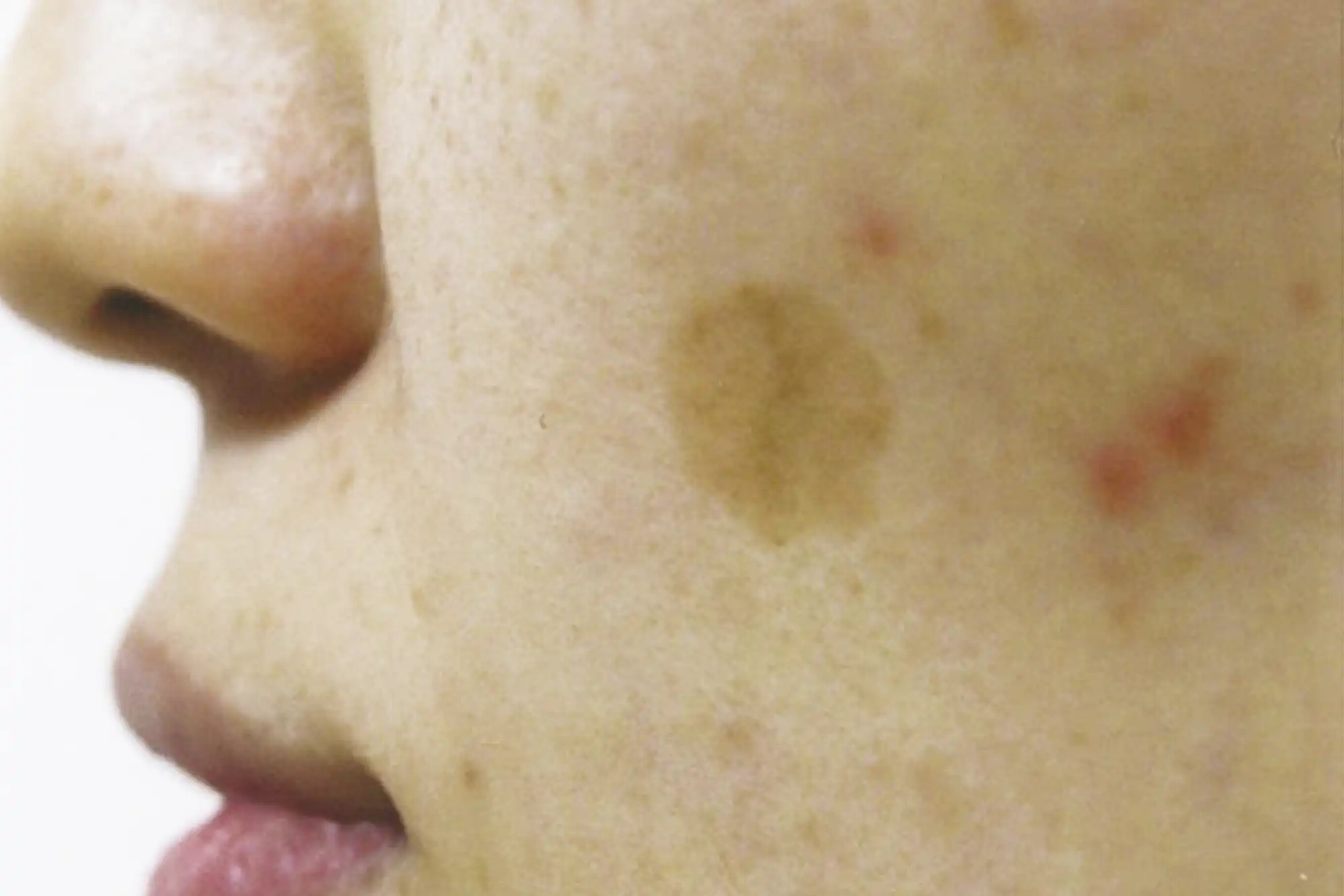 「肝斑(かんぱん)」とは、境界がはっきりせずさまざまな形状に広がるシミで、薄褐色から濃褐色に骨上や頬、鼻の下、額、口周りなどに左右対称に発生するのが特徴です。